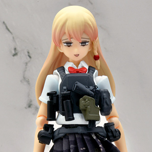 ミリタリー女子高生作品「リトルアーモリー」のノーネームキャラFの新スタイルです。今作は黒基調の装備パーツと、迷彩柄の布製スカートを採用。黒装備は威圧効果と、夜間の低視認性を目的として、主に特殊部隊が愛用するカラーリングです。バリアント“F”は、ロングストレートヘアのキャラクターに、ファーストラインのベルト、ローファーを装備した“ミニマム”セットアップです。ヘア&アイカラーも変更されており、従来品との組み換えもお楽しみ頂けます。