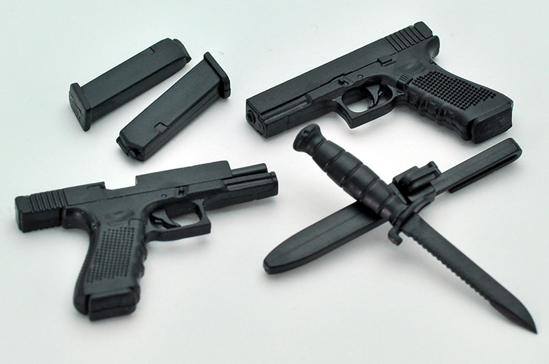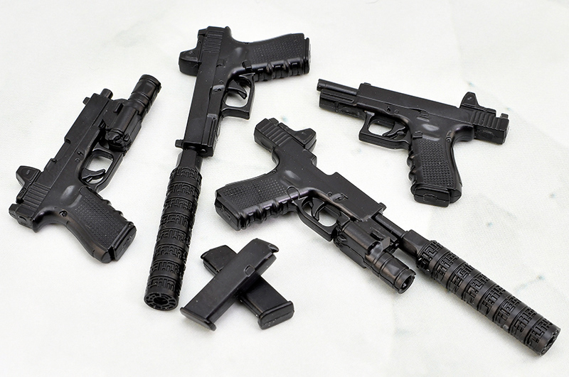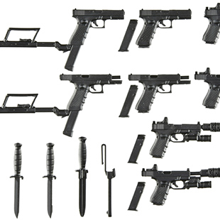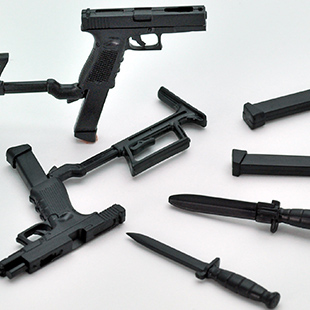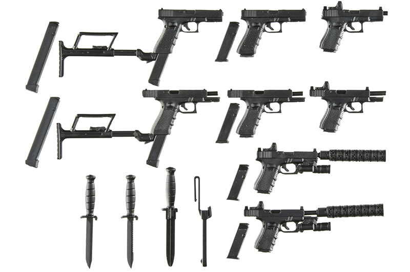 17、18C、19をセット化した1/12スケールモデルです。特にG19は、米国特殊作戦軍採用拳銃Mk27mod2の形状を新規設計で再現。「現代版ソーコムピストル」のデザインをご堪能ください。